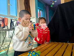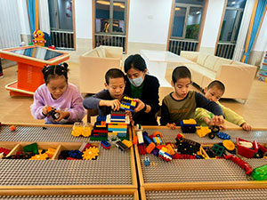 外面天寒地冻,漆黑一片,那就留在温暖明亮的屋里吧。妈妈们为了丰富晚餐后的时光,根据孩子们的能力,分别带孩子们进行适宜的精细运动。大大的乐高操作台,妈妈跟孩子们发挥创造;