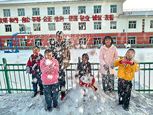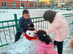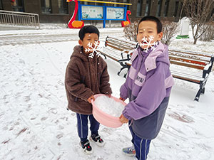 谁能错过这第一场雪呢!雪后,孩子们穿戴整齐,带上雪具,玩起来。打雪仗,堆雪人,挖雪,铲雪,最后还盛了满满几大盆,带回家……给行动不便的孩子们玩。那种冰凉的感觉,爽!